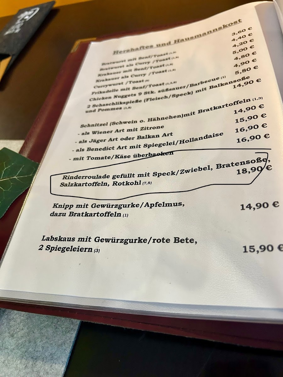 Expect comforting favorites like Grünkohl, hearty Bauernfrühstück, and Jägerschnitzel with crispy Bratkartoffeln alongside warming classics such as Sauerbraten and Hühnerfrikassee. For a quick bite or something to share, choices like Currykrakauer with pommes frites fit well with a laid-back atmosphere. Traditional desserts, including Schokoladenpudding and Vanilleeis with hot cherries and cream, provide a simple, satisfying finish to the meal.
