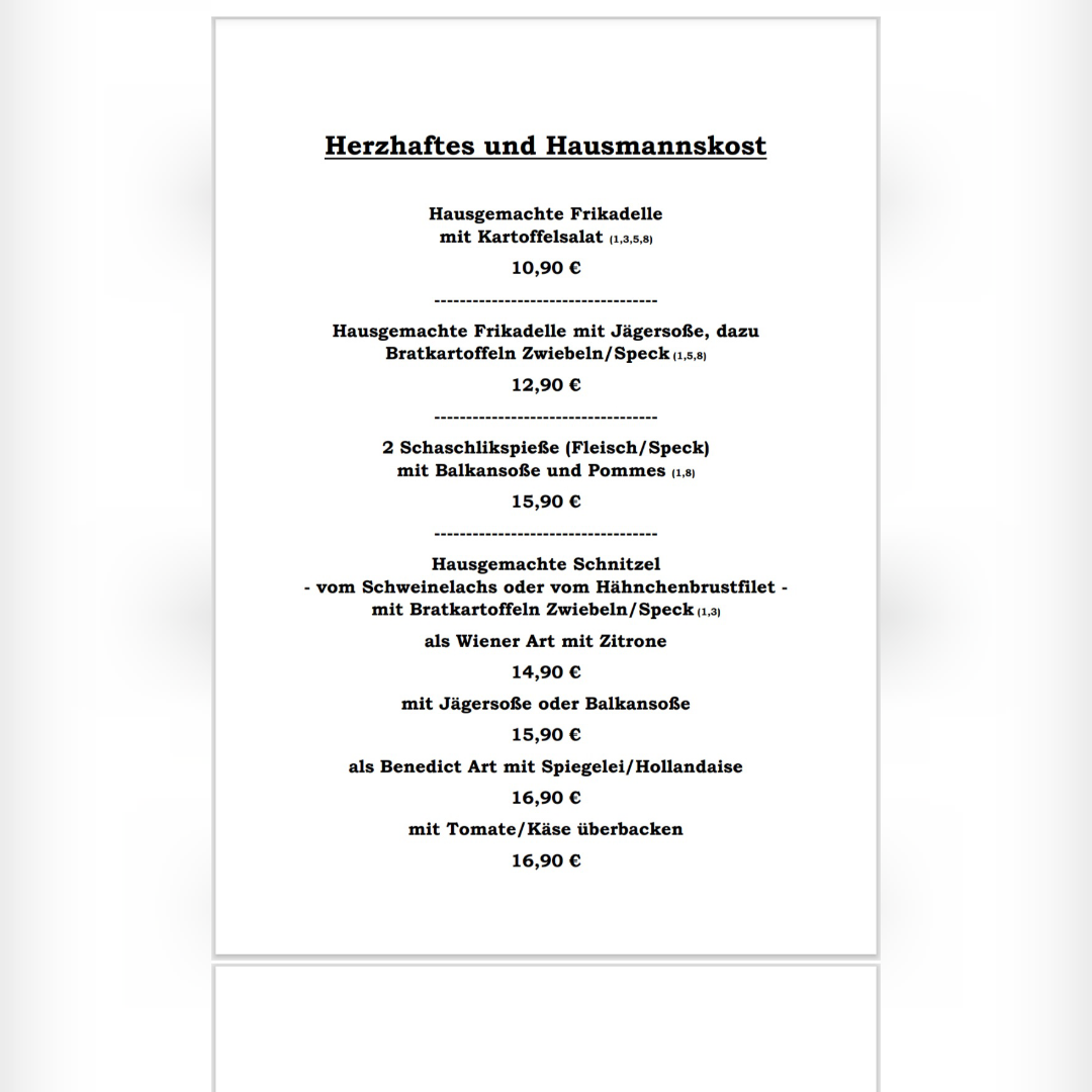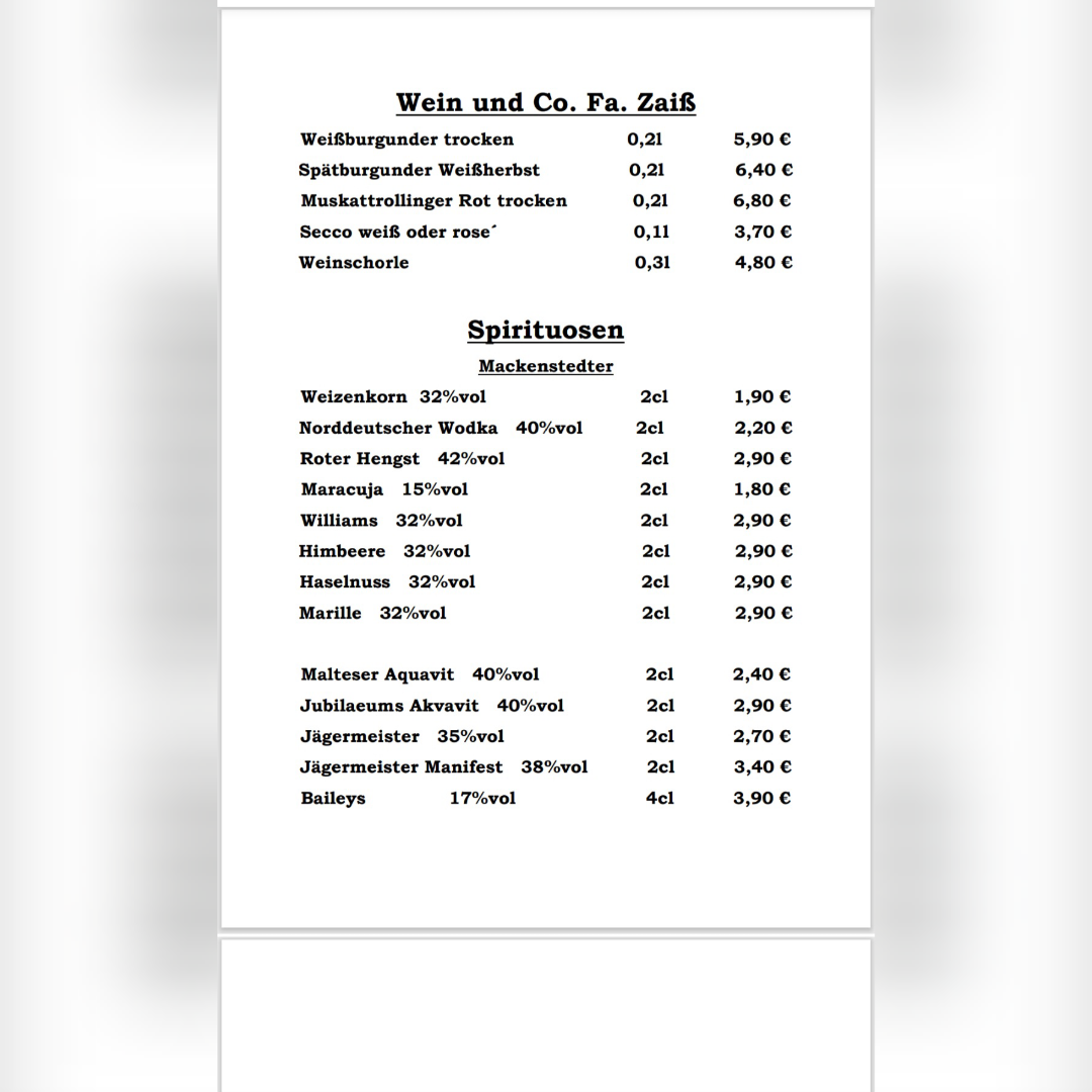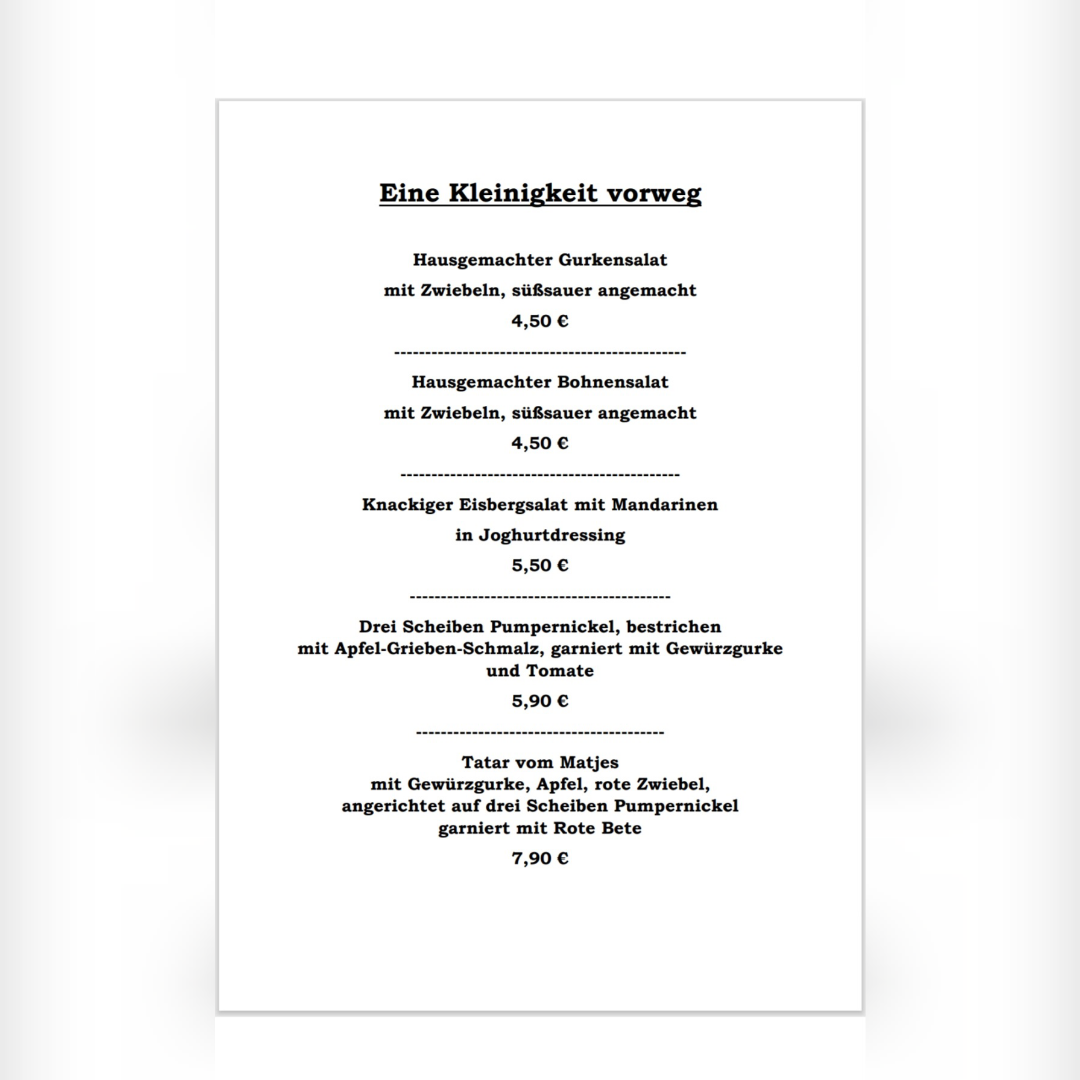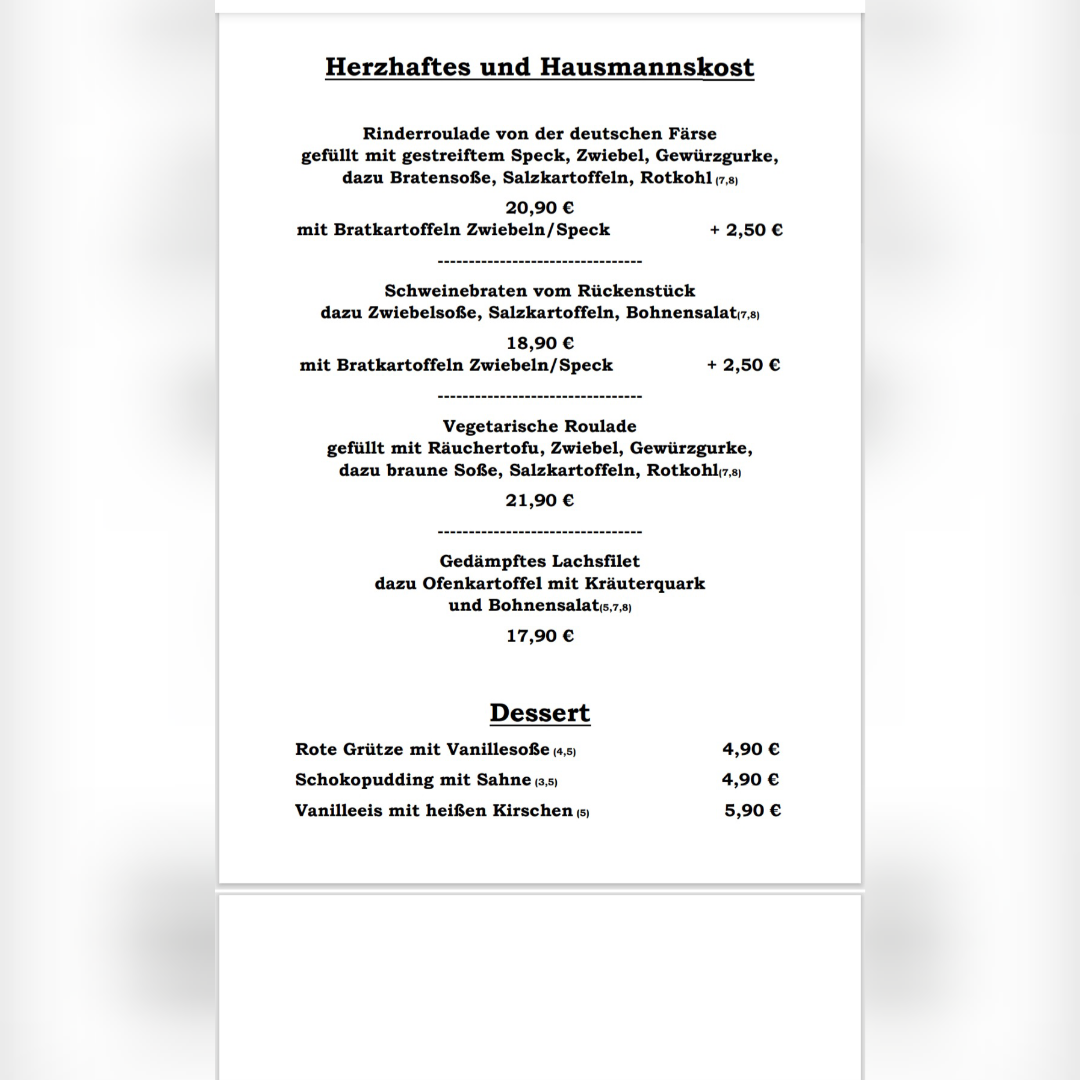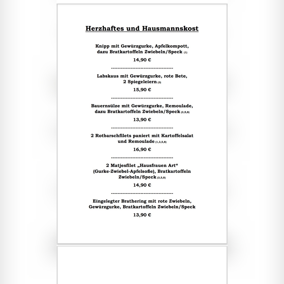 Das Wir-Bremen offers a menu built around traditional Northern German comfort food served in a relaxed, family-friendly setting. The selection focuses on hearty dishes that suit midday meals and casual dinners, with many options available for takeout. Whether you’re settling in for a comforting lunch or picking up a classic German dinner to enjoy at home, the menu balances straightforward, familiar flavors with homestyle preparation.